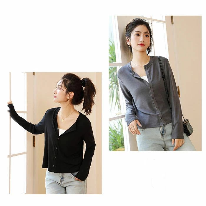 Crop Cardigan Rajutan V-Neck Lengan Panjang untuk gaya kekinian yang cozy. Tersedia warna hitam dan putih. Material nyaman, cocok untuk layering sehari-hari atau acara kasual.